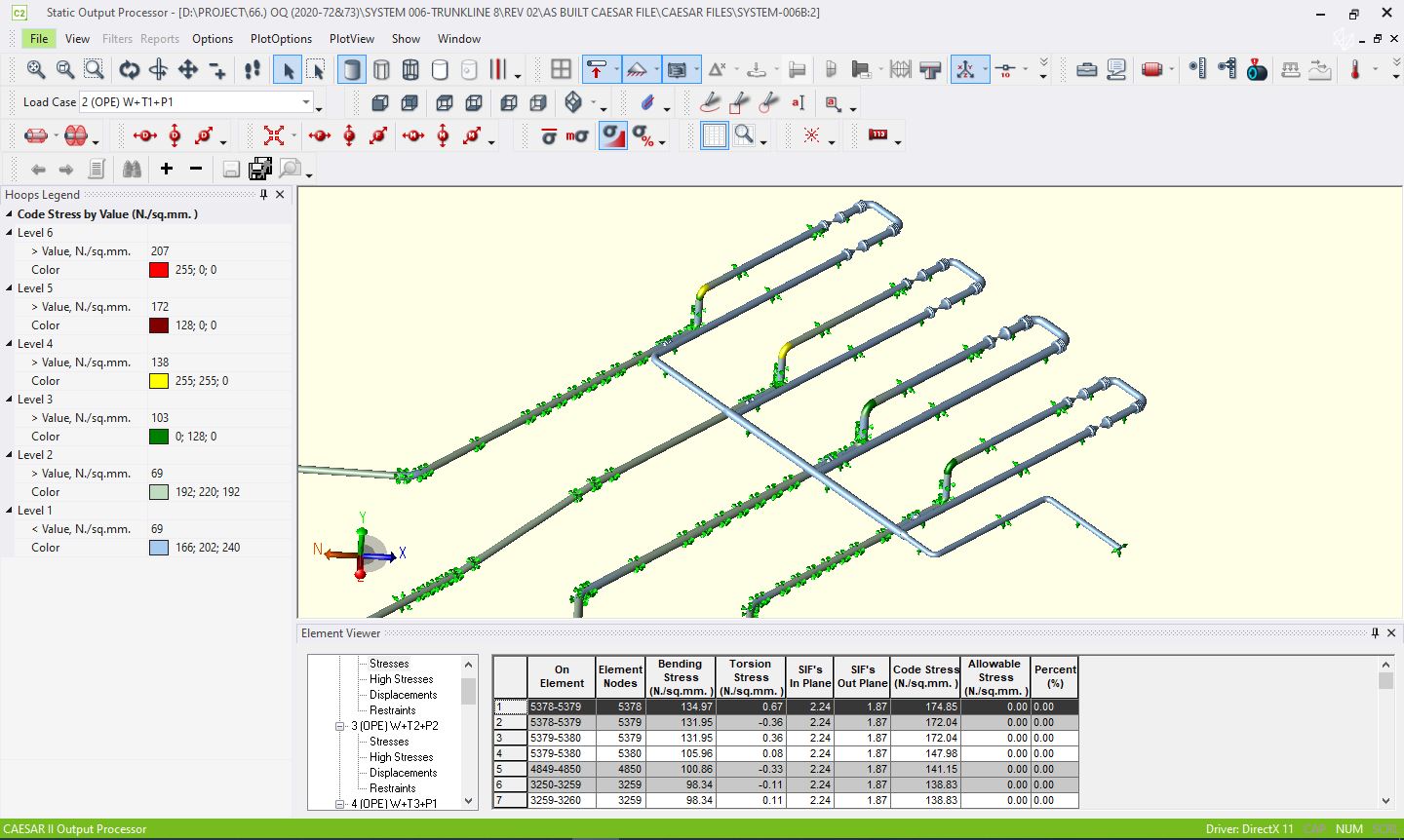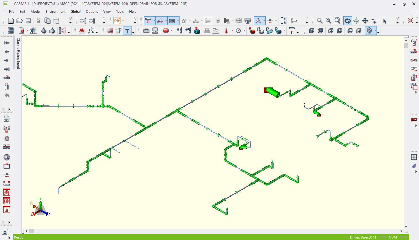 Complete Stress Analysis of piping systems is performed using Caesar II, covering metallic pipes and equipment for system design. The results of analysis are provided to the customer with all required details, recommendations, and modifications in the system if required.